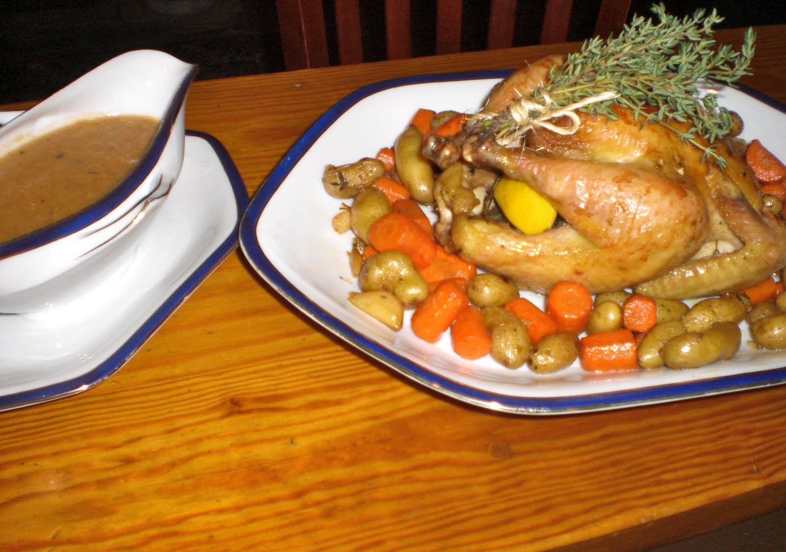 Depending on the season, vary your sides. It is so easy to throw veggies into the roasting pan while the chicken does it's thing. I used typical vegg that I have laying around (i am currently the poorest of church mice): carrots, potatoes, and lots of garlic. I also made a quick gravy with the drippings left on the bottom of the pan. This was my first lesson at cooking school and is the best cooking basic to know.. get on it. x